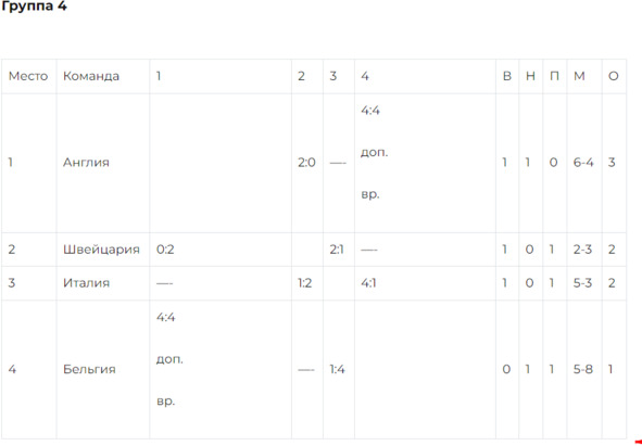 В этом туре Италия разгромила сборную Бельгии со счетом 4—1, а англичане победили сборную Швейцарии со счетом 2—0! И поэтому Швейцария и Италия оспаривали вторую путевку в выход плей офф, сыграв дополнительный матч, который завершился убедительной победой швейцарцев со счетом 4—1.