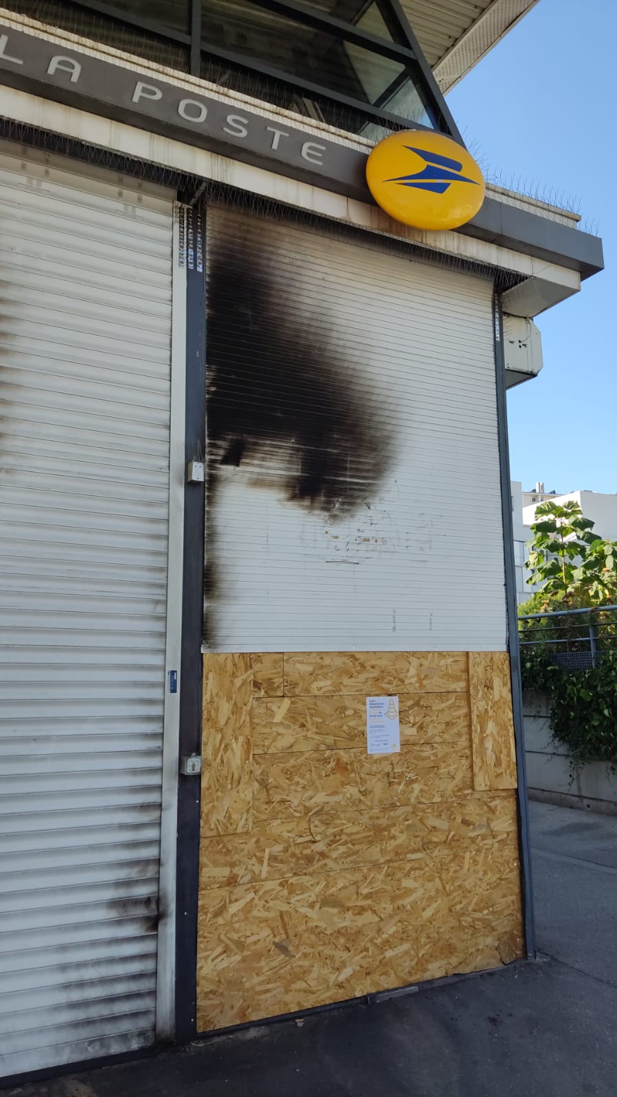 Этот почтовый офис в Лионе подожгли, но вовремя подоспели пожарные. На приклеенной к фанере бумаге написано: «В следствие серьёзного ущерба почта района Мермоз закрыта на неопределённый срок». Получается, крушили действительно всё подряд, даже почтовые службы. А они-то в чём провинились?