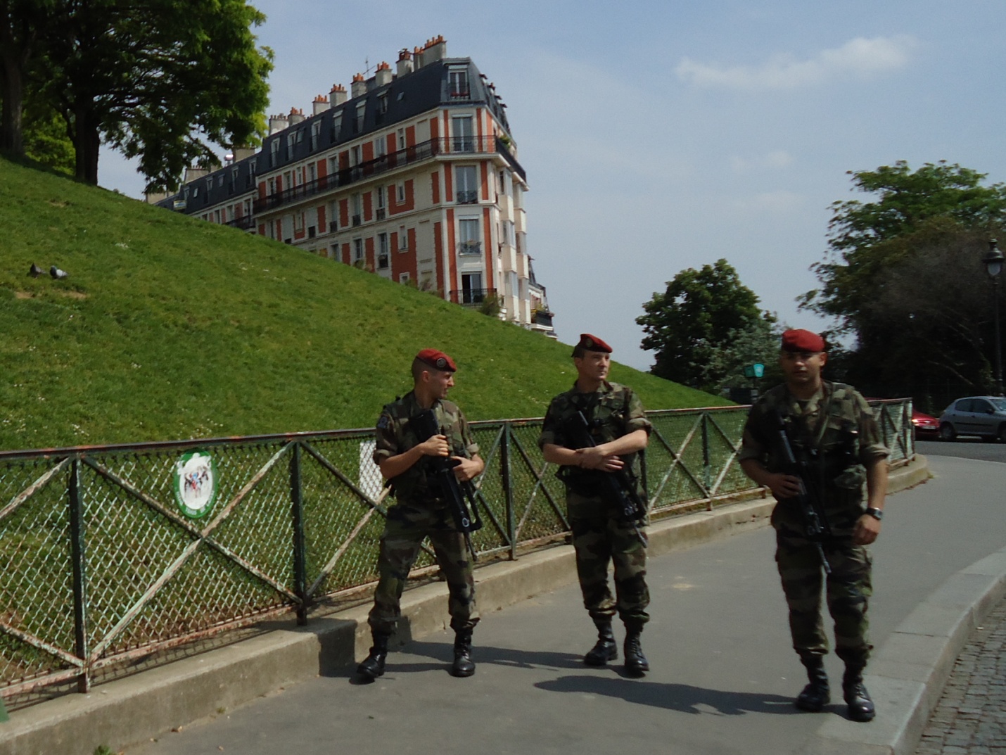 Это не военное положение. Нет, обычные парижские будни. Военный патруль около Монмартра (терактов в «Батаклане» и в брюссельском аэропорту ещё не было, патрули уже ходили, но оказывали только моральное воздействие). У крайнего слева на плече висит автомат «FAMAS»