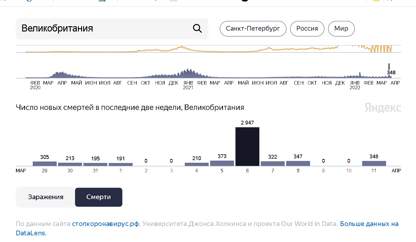 Но КОВИД не только отвлекал внимание от насущных проблем, он ещё и убивал. И это рано или поздно могло вызвать взрыв негодования со стороны населения. Ведь власти многих европейских стран продемонстрировали беспомощность и нераспорядительность в борьбе с коронавирусным злом. (об этом в книге: Иван Карасёв. «Моя Франция. Обратится ли сказка в кошмар?», СПб, «Алетейя», 2022). И тут всю правду нельзя было выпускать на свет Божий. Поэтому приходилось манипулировать данными о смертях и, возможно, скрывать их. То есть любую правдивую информацию надо дозировать. Во Франции, к примеру, в отдельные периоды количество умерших падало почти до нуля на выходных, как будто смерти в больницах в субботу и воскресенье никто не регистрировал. Ещё интереснее порой выглядела британская статистика, привожу табличку, сделанную по данным сайта стопкоронавирус.рф, университета Джона Хопкинса и проекта Our World in Data. Верхний, трудно читаемый график – данные за 2020 – начало 2022 годов, нижний ряд столбцов – данные за март-апрель 2022. И вот стоит просто глянуть на него, как начинаешь поражаться: как так случилось, что в какие-то дни в Великобритании умирало по 200-300 человек, а 6-го апреля аж 2947, зато 2,3, 9 и 10 апреля – не зарегистрировали ни одной смерти!
