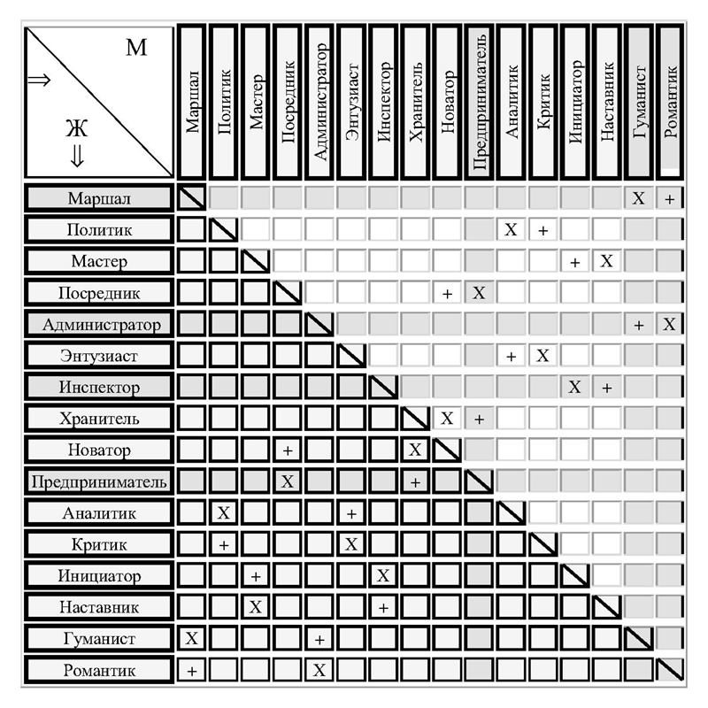 Условные обозначения: Ж – ниже диагонали – территория женского доминирования в отношениях с мужчинами – в затемненном поле таблицы; (+) – комфортные; (X) – конфликтные; М – Выше диагонали – территория; мужского доминирования в отношениях с женщинами – в светлом поле таблицы; (X) и (+) – если они стоят на затемненном месте, то их можно принимать условно при определенных оговорках; пустой прямоугольник серого цвета – зоны наиболее проблемных взаимоотношений.