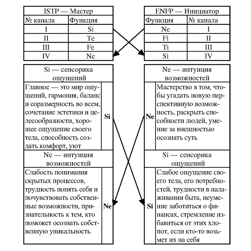 Дуальность означает и комфортное гостеприимство, и интересное общение, которое никогда не надоедает. В поведении партнеры уравновешивают друг друга, создавая ощущение психологической «невесомости». Не надо контролировать свои поступки, можно оставаться самим собой. Из-за того, что обязанности в любом деле распределяются почти автоматически, экономится немало энергии для новых дел. Разногласия и споры улаживаются не путем компромисса – нахождения средней линии, – а путем сотрудничества, то есть истинные нужды другого известны и их удовлетворяют. Интертипные отношения лежат в основе истинных привязанностей. Полную таблицу интертипных отношений см. в Приложении № 3.
