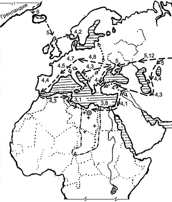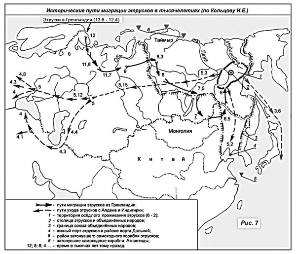 Исследованиями установлено, что значительная часть этрусков ушла из бассейна рек Алдан и Индигирка из-за холодов, где они с родственными народами жили в течение тысяч лет. В районе Южного Урала их миграционный поток разделился около 5 тысяч лет назад. Одни роды ушли в южном направлении восточнее Каспия к истокам рек Тигр и Евфрат. Другие роды этрусков ушли в район Днепра и Карпат (см. рис. 8). Отсюда 4,8 тыс. лет назад разными потоками они уходили в центральную Европу, через Испанию – в Африку, в северные районы Алжира и Туниса (Карфагена). Следующий поток около 4,3 тыс. лет назад ушел к Адриатическому морю (в Иллирию). 4 тысячи лет назад часть этрусков ушла к Эгейскому морю, где они создали легендарную Трою на Европейском континенте у подножия холма на берегу реки, которая впадает в Саросский (Саросский, Этрусский) залив. Сейчас около 7 км южнее бывшей Трои находится городок Кадыкей.