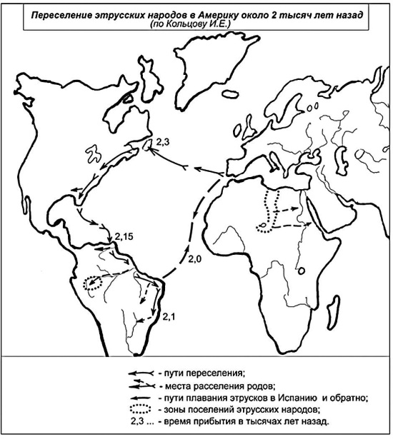 Достигнув берегов Северной Америки, 2,3 тысяч лет назад этрусские народы ушли в южном направлении в район Амазонии, Рио-де-Жанейро и Сантус. На пути следования некоторая часть народа оседала на новых землях, начиная с Флориды, постепенно проникая в глубь континента (см. рис. 9).