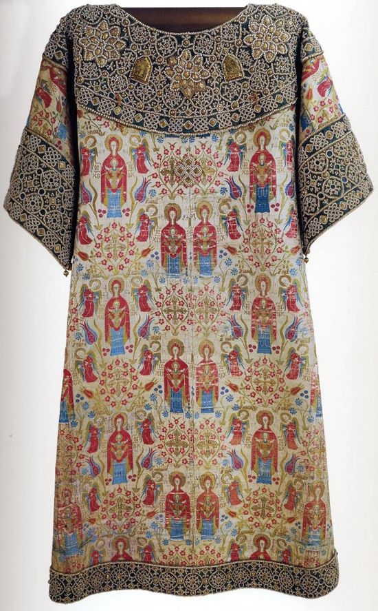 Вот, между прочим, краткий перечень особенных достопримечательностей: саккос[99] митрополита Дионисия, в коем весу 1,5 пуда, два саккоса митрополита Фотия, на одном из коих нанизано до 70 тысяч жемчужных зерен[100], на полах второго вышит золотом Символ православной веры. Перстосложение на саккосе в двух видах: двуперстное и именословное. Этим саккосом руководствовался Никон при исправлении Символа веры в книгах, а патриарх Иоаким доказывал, что нет в Символе слова истинного, которого держатся старообрядцы. Епитрахиль митрополита Фотия составляет редкий памятник греческого искусства[101]. Древнейший из омофоров[102] приписывается св. Николаю Чудотворцу или же его современнику, Александру, епископу Александрийскому, бывшему на первом Вселенском соборе в Никее. Эту древность привез с собой из Никеи в Москву Григорий, митрополит никейский, в дар царю Алексею Михайловичу в 1654 году. Григорий нашел его в ризнице своей митрополии. Медный перстень с синим стеклом, на котором вырезан дракон, – подарок хана Чанибека св. Алексию за чудесное излечение в 1357 году жены его Тайдулы. Саккос св. Петра-митрополита, сделанный в 1322 году, и есть древнейший из всех митрополичьих украшений. Посох[103] и часы патриарха Филарета, два посоха патриарха Никона; его же четки[104] из белой рыбьей кости с золотой, украшенной жемчугом кистью. Тут же хранятся и сосуды для мироварения, совершающегося в известное время в Крестовой патриаршей палате, которая находится рядом с церковью Двенадцати Апостолов…