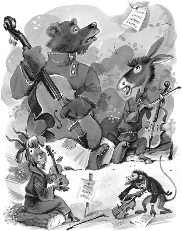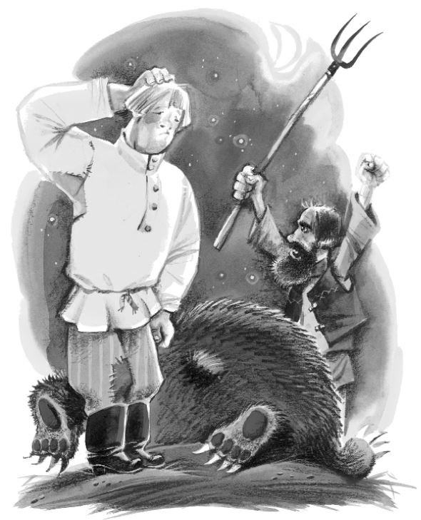 Большой собравшися гурьбой,        Медведя звери изловили;        На чистом поле задавили —         И делят меж собой,         Кто чтó себе достанет.А Заяц за ушко медвежье тут же тянет.         «Ба, ты, косой, —Кричат ему, – пожаловал отколе?        Тебя никто на ловле не видал». —        «Вот, братцы!» Заяц отвечал:«Да из лесу-то кто ж, – всё я его пугал        И к вам поставил прямо в поле         Сердечного дружка?»Такое хвастовство хоть слишком было явно,        Но показалось так забавно,Что Зайцу дан клочок медвежьего ушка.        Над хвастунами хоть смеются,А часто в дележе им доли достаются.