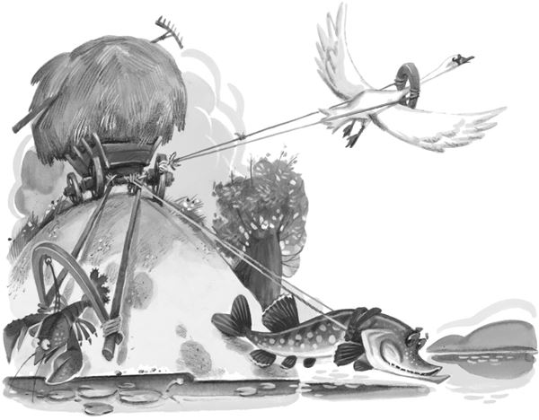 Когда в товарищах согласья нет,        На лад их дело не пойдёт,И выйдет из него не дело, только мука.        Однажды Лебедь, Рак да Щука        Везти с поклажей воз взялись,        И вместе трое все в него впряглись;Из кожи лезут вон, а возу всё нет ходу!Поклажа бы для них казалась и легка:        Да Лебедь рвётся в облака,Рак пятится назад, а Щука тянет в воду.Кто виноват из них, кто прав, – судить                                                                       не нам;        Да только воз и ныне там.