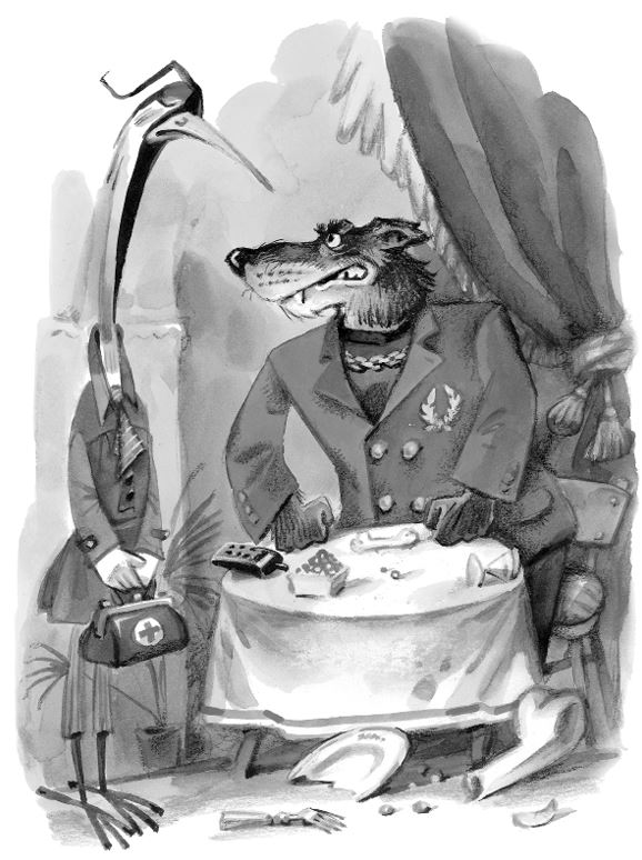 Что волки жадны, всякий знает:        Волк, евши, никогда        Костей не разбирает.За то на одного из них пришла беда:Он костью чуть не подавился.Не может Волк ни охнуть, ни вздохнуть;        Пришло хоть ноги протянуть!По счастью, близко тут Журавль случился.Вот, кой-как знаками стал Волк его манить        И просит горю пособить.        Журавль свой нос по шеюЗасунул к Волку в пасть и с трудностью                                                                        большеюКость вытащил и стал за труд просить.