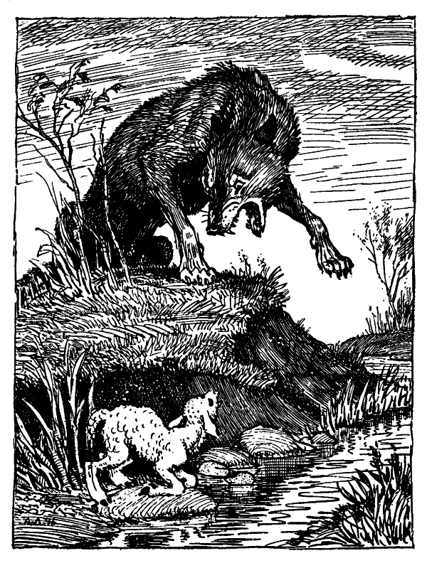 У сильного всегда бессильный виноват:Тому в Истории мы тьму примеров слышим,Но мы Истории не пишем;А вот о том как в Баснях говорят.Ягненок в жаркий день зашел к ручью напиться;И надобно ж беде случиться,Что около тех мест голодный рыскал Волк.Ягненка видит он, на дóбычу стремится;Но, делу дать хотя законный вид и толк,Кричит: «Как смеешь ты, наглец, нечистым рыломЗдесь чистое мутить питьеМоеС песком и с илом?За дерзость таковуЯ голову с тебя сорву».«Когда светлейший Волк позволит,Осмелюсь я донесть, что ниже по ручьюОт Светлости его шагов я на сто пью;И гневаться напрасно он изволит:Питья мутить ему никак я не могу».«Поэтому я лгу!Негодный! слыхана ль такая дерзость в свете!Да помнится, что ты еще в запрошлом летеМне здесь же как-то нагрубил:Я этого, приятель, не забыл!»«Помилуй, мне еще и от роду нет году», —Ягненок говорит. «Так это был твой брат».«Нет братьев у меня». – «Так это кум иль сват,И, словом, кто-нибудь из вашего же роду.Вы сами, ваши псы и ваши пастухи.Вы все мне зла хотите,И если можете, то мне всегда вредите,Но я с тобой за их разведаюсь грехи».«Ах, я чем виноват?» – «Молчи! устал я слушать,Досуг мне разбирать вины твои, щенок!Ты виноват уж тем, что хочется мне кушать».Сказал – и в темный лес ягненка поволок.