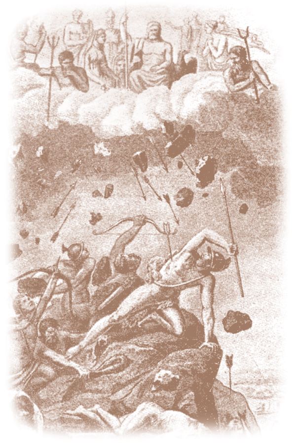 Был в древности народ, к стыду земных племен,Который до того в сердцах ожесточился, Что противу богов вооружился.Мятежные толпы, за тысячью знамен,Кто с луком, кто с пращей, шумя, несутся в поле. Зачинщики, из удалых голов, Чтобы поджечь в народе буйства боле,Кричат, что суд небес и строг, и бестолков;Что боги или спят, иль правят безрассудно; Что проучить пора их без чинов;Что, впрочем, с ближних гор каменьями нетрудно На небо дошвырнуть в богов И заметать Олимп стрелами.Смутяся дерзостью безумцев и хулами,К Зевесу весь Олимп с мольбою приступил, Чтобы беду он отвратил;И даже весь совет богов тех мыслей был,Что, к убеждению бунтующих, не худо Явить хоть небольшое чудо: Или потоп, иль с трусом гром,Или хоть каменным ударить в них дождем. «Пождем, — Юпитер рек, – а если не смирятсяИ в буйстве прекоснят, бессмертных не боясь, Они от дел своих казнятся». Тут с шумом в воздухе взвиласьТьма камней, туча стрел от войск богомятежных,Но с тысячью смертей, и злых, и неизбежных,На собственные их обрушились главы. Плоды неверия ужасны таковы; И ведайте, народы, вы,Что мнимых мудрецов кощунства толки смелы,Чем против божества вооружают вас, Погибельный ваш приближают час,И обратятся все в громовые вам стрелы.