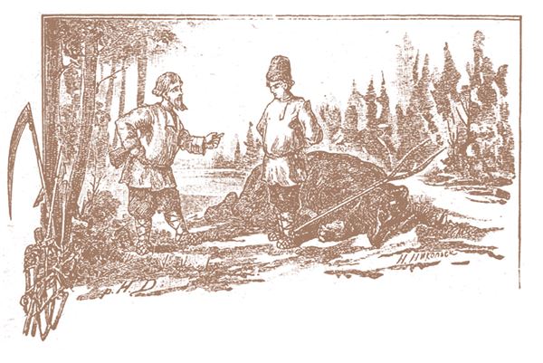 Когда у нас беда над головой, То рады мы тому молиться, Кто вздумает за нас вступиться; Но только с плеч беда долой,То избавителю от нас же часто худо: Все взапуски его ценят; И если он у нас не виноват, Так это чудо! Старик-Крестьянин с Батраком Шел под вечер леском Домой, в деревню, с сенокосу,И повстречали вдруг медведя носом к носу. Крестьянин ахнуть не успел, Как на него медведь насел.Подмял Крестьянина, ворочает, ломает,И, где б его почать, лишь место выбирает: Конец приходит старику. «Степанушка родной, не выдай, милой!» —Из-под медведя он взмолился Батраку.Вот, новый Геркулес, со всей собравшись силой, Чтó только было в нем, Отнес полчерепа медведю топоромИ брюхо проколол ему железной вилой. Медведь взревел и зáмертво упал: Медведь мой издыхает. Прошла беда; Крестьянин встал, И он же Батрака ругает. Опешил бедный мой Степан.«Помилуй, – говорит, – за что» – «За чтó, болван! Чему обрадовался сдуру? Знай колет: всю испортил шкуру!»