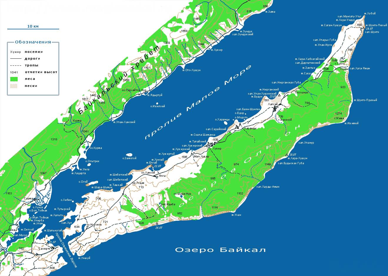 Остров Ольхон – самый большой, он обитаем. На территории расположены несколько поселков, самый крупный – Хужир (смотрите ниже карту). Численность населения острова – 1682 человека.