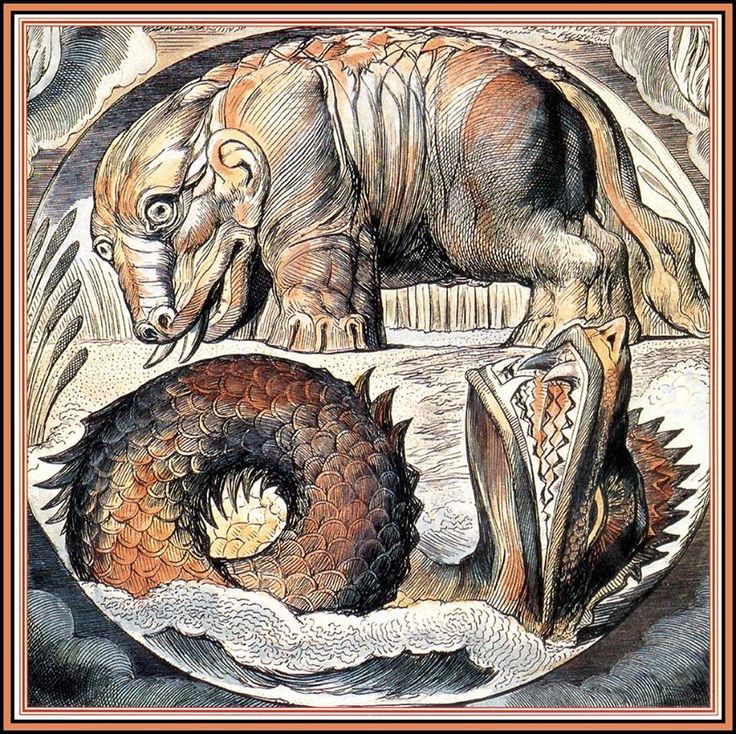 Так называемый «зверь морской» Левиафан имеет вязкую, текучую структуру, тогда как Бегемот существо монолитное, прямолинейно-устойчивое (его сила в чреслах его и крепость его в мускулах чрева его).
