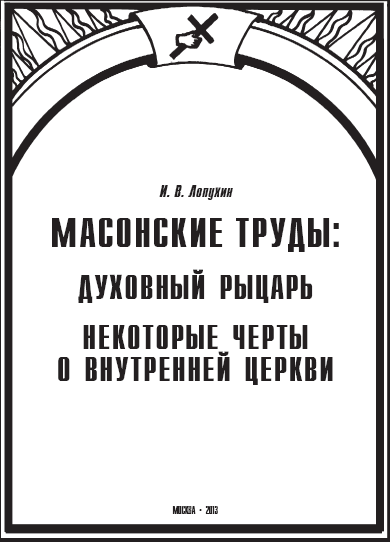 Но Лопухин не ограничивался лишь изданием переводных сочинений теоретического характера: он задумал также издать нечто вроде масонского журнала, долженствовавшего служить как бы летописью жизни русского масонства, под названием «Магазин свободно-каменщический»; в него должны были входить речи, произносимые в заседаниях лож, масонские песни и рассуждения и тому подобное. Однако вышло всего два выпуска этого издания (1784 г.); третий выпуск был начат печатанием, но не вполне закончен; материал, относящийся к следующим частям, сохраняется в рукописном виде в Императорской Публичной библиотеке. Наконец, Лопухин выступал и в качестве самостоятельного автора: ему принадлежит несколько сочинений масонского содержания, особенно интересных и ценных для нас потому, что вообще русские масоны большей частью ограничивались переводами иностранных книг и статей по интересующим их вопросам и редко выступали самостоятельно. Первым литературным трудом Лопухина был небольшой франкмасонский катехизис[1], излагающий нравственные идеи масонства и изданный им первоначально на французском языке под названием: «Catéchisme moral pour les vrais F. M.», а затем переведенный самим автором на русский язык и присоединенный к его последующим сочинениям: «Духовный Рыцарь» (1791) и «Некоторые черты о внутренней Церкви» (1798). Из них последнее было также издано первоначально на французском языке (в Петербурге) и распространялось в качестве произведения неизвестного иностранного автора. В 1801 г. оно было вторично издано в Париже: с этого французского издания было сделано два немецких перевода (Эвальда и Юнг-Штиллинга); вообще в Германии эта книга пользовалась большим уважением и успехом среди немецких масонов и вызвала чрезвычайно похвальный отзыв такого выдающегося писателя-мистика, как Эккартсгаузен.