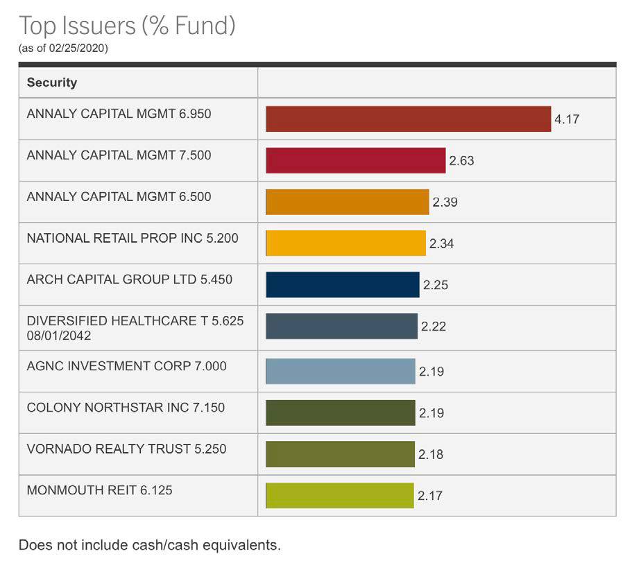 Остальная (кроме Annaly, на которую в общей сложности приходится 9,19%) часть портфеля фонда в высшей степени диверсифицирована. Следующая по величине доля – 2,34% портфеля – принадлежит серии привилегированных акций National Retail Properties (NNN), по которым выплачивается 5,2% годовых. В целом, 10 крупнейших компаний составляют 31,92% активов фонда, включая непропорционально большое присутствие Annaly. Обзор каждой позиции PFFR отнял бы слишком много времени; проще и интереснее посмотреть, на что компания делает ставку.