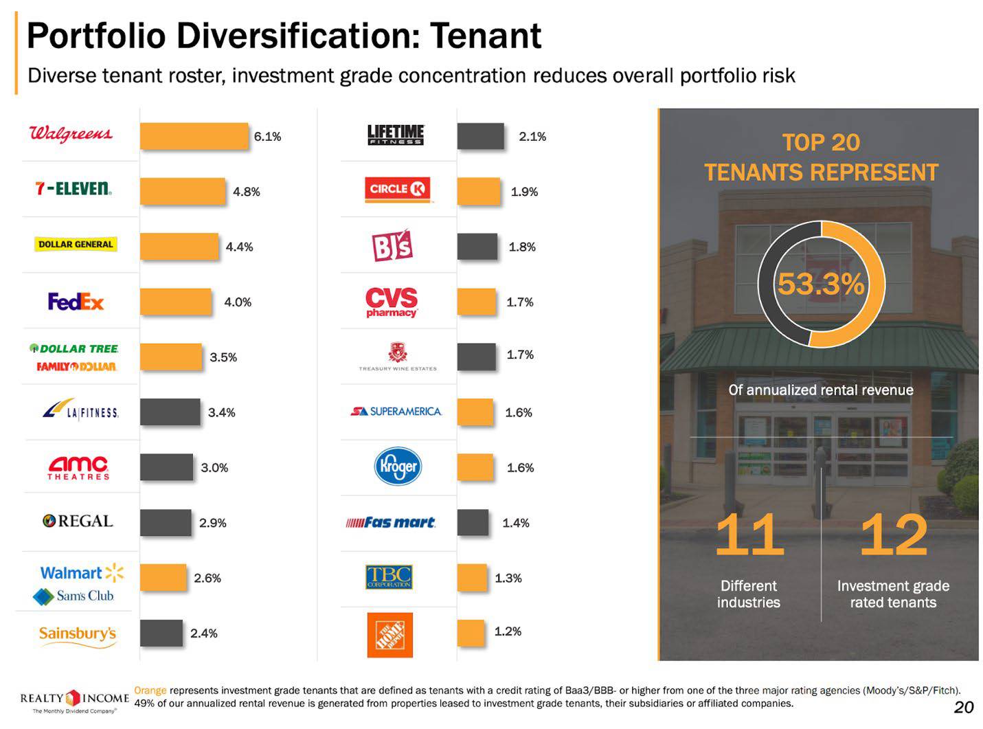 На сегодняшний день только 94 из 6483 объектов Realty Income открыты для аренды. Их площади распределены между 301 коммерческими арендаторами, представляющими 50 отраслей и 49 штатов, а также Пуэрто-Рико и Великобританию. Диверсификация присутствует даже среди крупнейших арендаторов компании. 20 самых крупных из них создают всего 53,3% дохода компании от аренды и представляют 11 разных отраслей. Наибольшая доля приходится на Walgreens Boots Alliance (WBA) – в прошлом году она составила только 6,1% от всех продаж. На втором месте 7-Eleven с 4,8% от общей выручки траста.