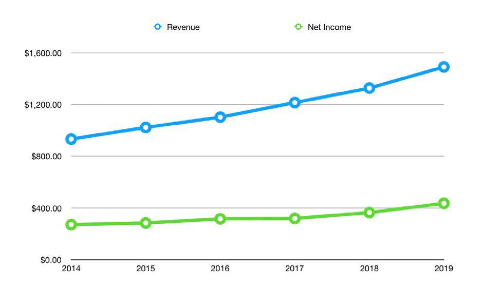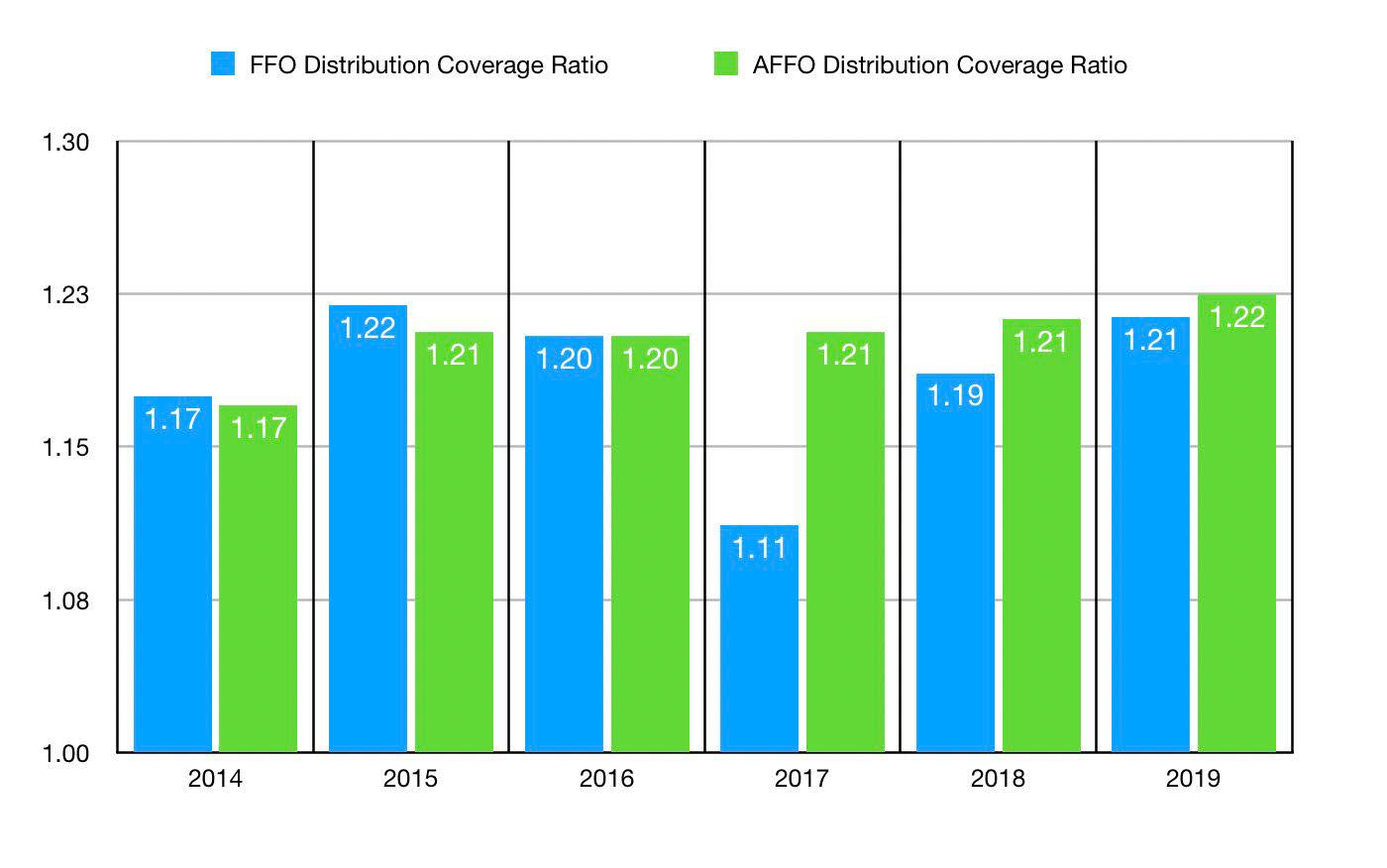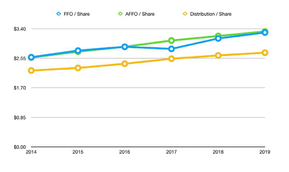 Вполне ожидаемо, такая инвестиционная характеристика, как высокая доходность, выливается в устойчивые финансовые показатели. За период с 2014 по 2019 год выручка компании выросла на 59,8%, или на 9,8% в годовом исчислении, – с $933,51 млн до $1,49 млрд, а чистая прибыль увеличилась на 60,5% и составила $436,50 млн. Но есть и другие, намного более важные показатели, такие как средства от операций (FFO) и скорректированные средства от операций (AFFO) компании. За шесть лет FFO в пересчете на акцию вырос на 27,5% – с $2,58 до $3,29, а AFFO на акцию вырос на 29,2% – с $2,57 до $3,32.