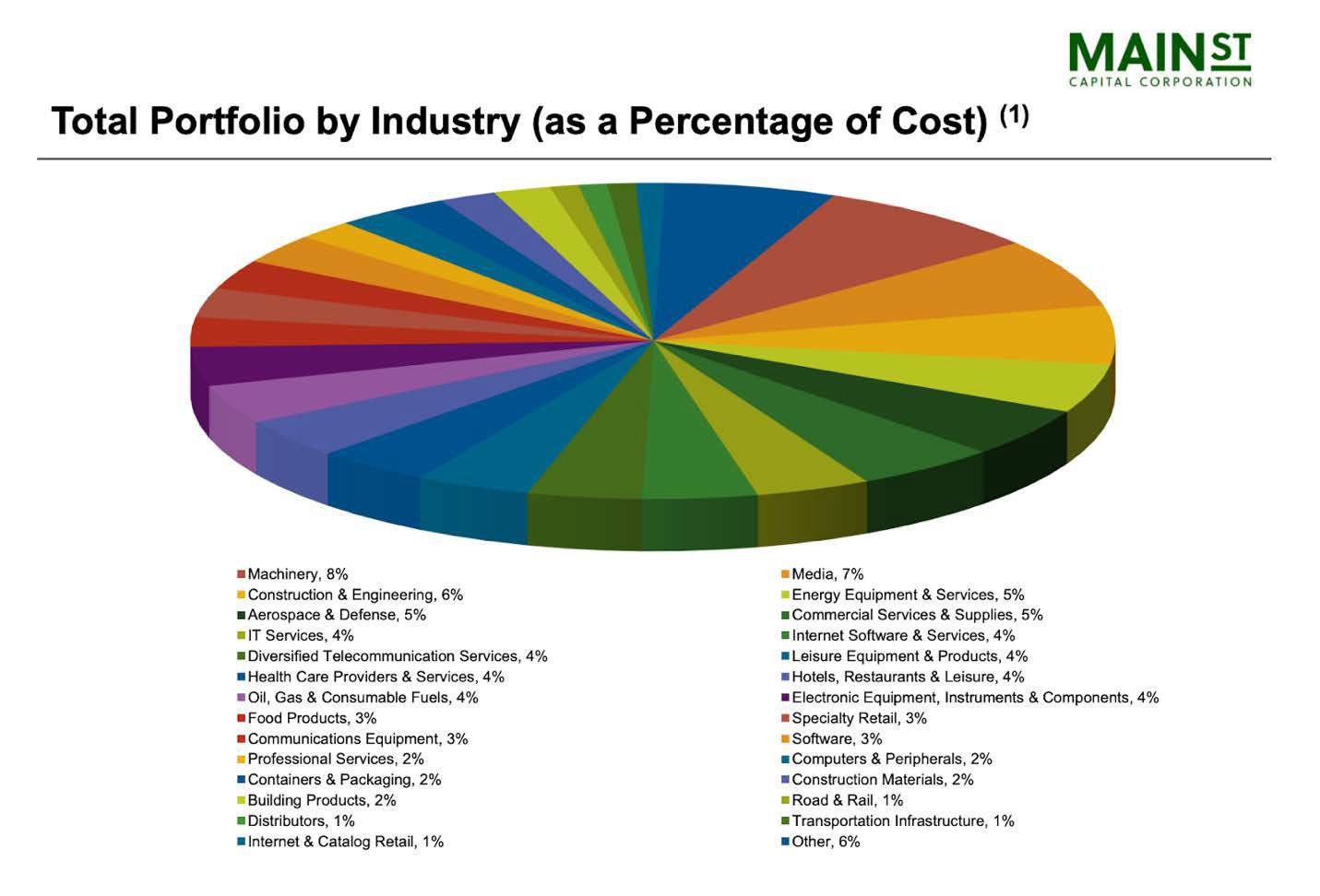 В целом, Main Street Capital применяет хорошую диверсификацию, участвуя в нескольких отраслях экономики. Самая большая доля припадает на производство машин и оборудования, но это всего 8% от общего портфеля компании.