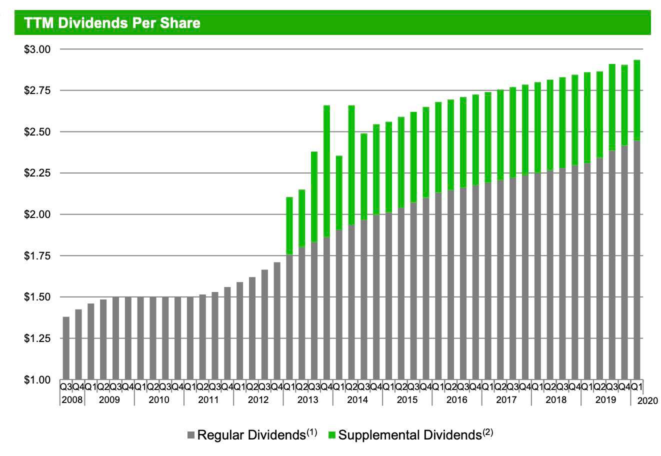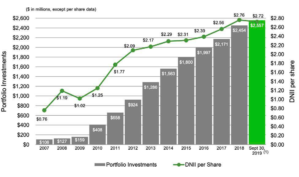 Компания Main Street Capital демонстрирует во всех отношениях сильную динамику. Налицо не только успешное наращивание активов, находящихся под ее управлением (AUM), но и увеличение распределенного чистого инвестиционного дохода (DNII) в пересчете на акцию. В 2018 году (последний полный отчетный год на момент написания данной статьи) показатель DNII компании составлял $2,76 на акцию. По итогам 12 месяцев, предшествующих окончанию третьего квартала прошлого года, DNII на акцию был чуть ниже – $2,72.