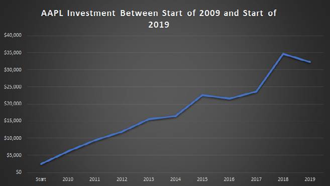 Допустим, в начале 2009 года инвестор купил акций AAPL на 2 500 $. К началу 2019 года эта инвестиция стоила бы более 32 тысяч!