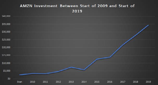 Инвестиция в AMZN за период с начала 2009 по начало 2019 года
