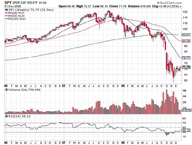 То была эйфория в чистом виде. Рынок рос, а рынок жилья переживал бум. Казалось, что на рынке все прекрасно, пока пузырь не лопнул. Испугавшись, толпа начала панически продавать. Посмотрите на недельный график ETF SPDR S&P 500 (SPY) за период с января 2006 по декабрь 2008 года.
