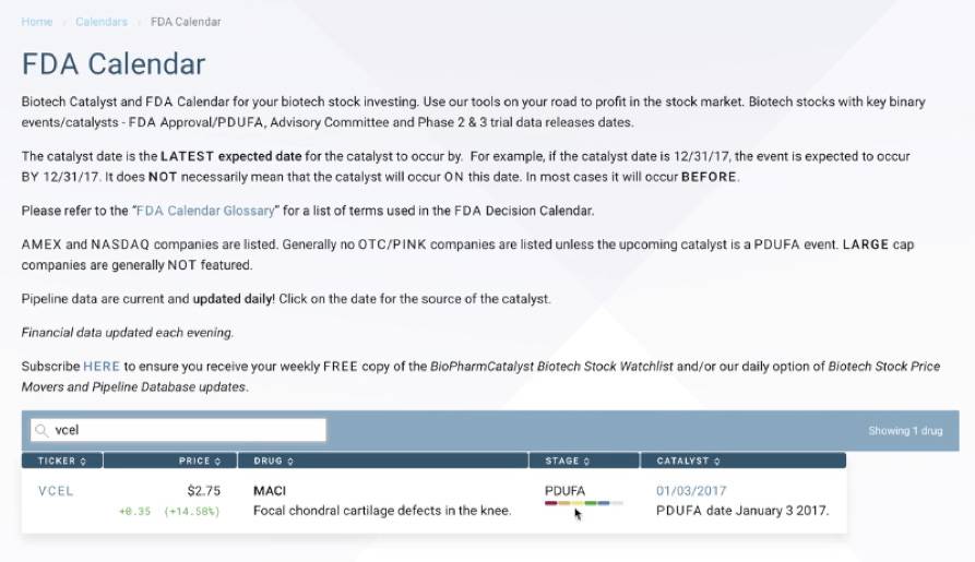 Теперь давайте рассмотрим пример. Vericel Corp. (NASDAQ: VCEL) – одна из акций, которую я торговал. Хочу пояснить вам основания для такой сделки. Дата получения компанией одобрения от FDA на их препарат MACI была назначена на 3 января 2017 года. Я нашел это событие примерно за месяц до намеченной даты. Для поиска я использовал сайт BioPharmCatalyst, показанный ниже: