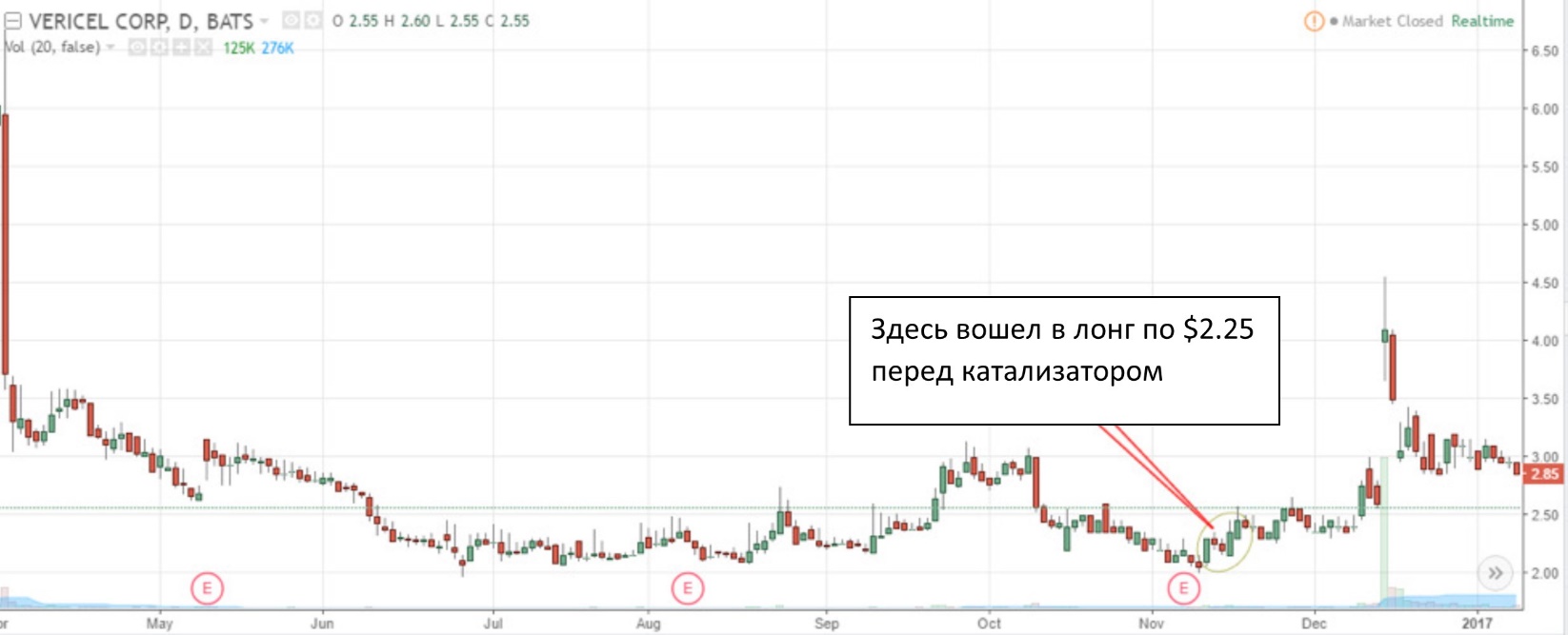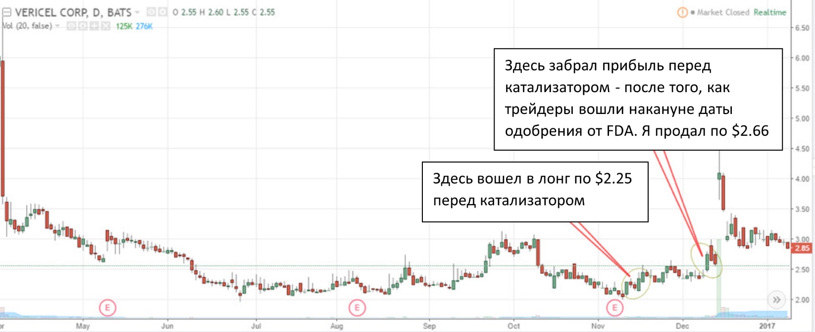Компания объявила о досрочном одобрении FDA, и ее акции подскочили до 3 долларов. Я совершил свинговую сделку примерно за три-четыре недели до появления этой информации, и она не зависела от того, будут ли результаты хорошими или плохими. Я забрал прибыль, получив вознаграждение за свои усилия. На мой взгляд, имеет смысл входить в подобные позиции именно так и выходить на росте накануне катализатора. В этом случае риск ниже, чем если сохранить позицию и ждать, куда пойдет цена. В конечном итоге, Vericel получила одобрение от FDA. Было бы неплохо держать такую позицию на момент выхода информации в середине декабря 2016 года, но исход был совершенно неясен. Свинговые трейдеры должны торговать на основании правил. На мой взгляд, если бы я сохранил ту позицию, это была бы игра наудачу, потому что данное событие могло привести к движению в любую сторону.