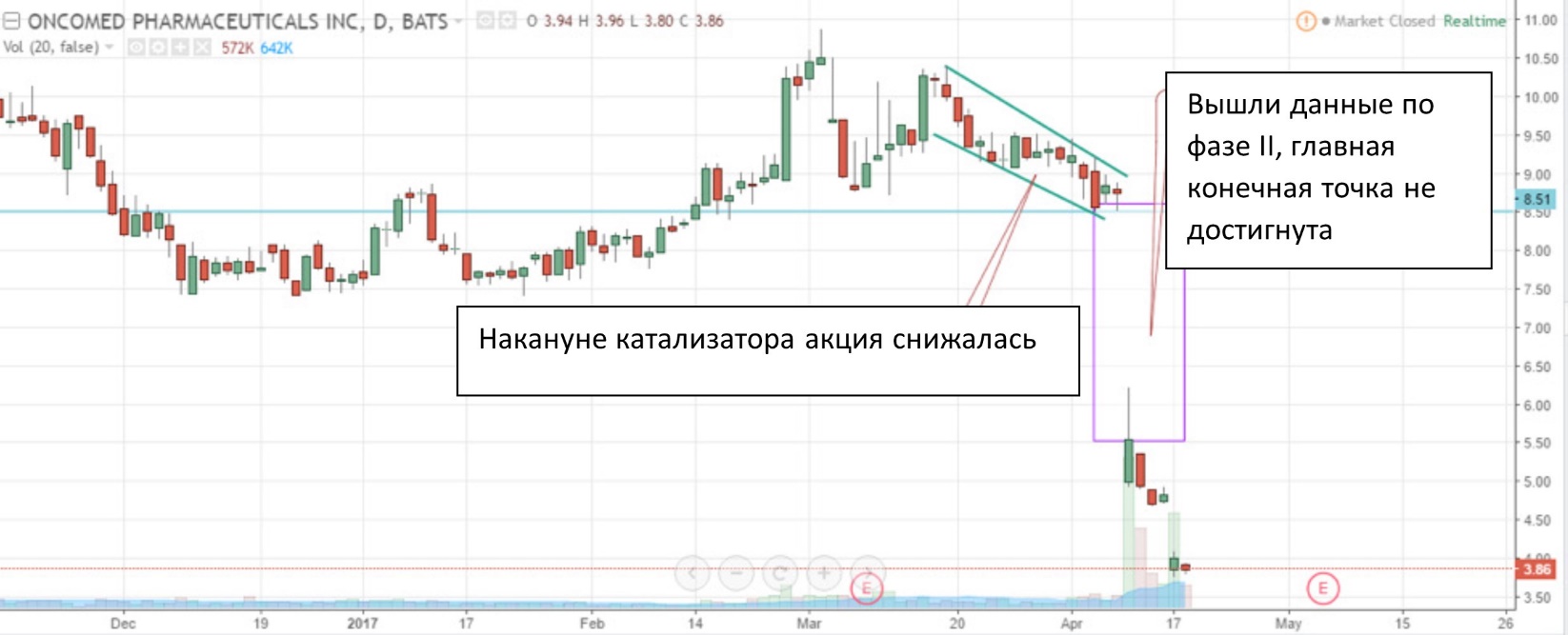 Рассмотрим еще один пример. Oncomed Pharmaceuticals Inc (NASDAQ: OMED) существенно упала накануне события. Оглядываясь назад, можно было бы сказать, что трейдерам стоило открыть позицию в шорт за несколько дней до события и выкупить акции до его объявления, как показано на графике ниже. Однако имейте в виду, что шортовые позиции рискованные, и начинающим трейдерам они, как правило, недоступны.