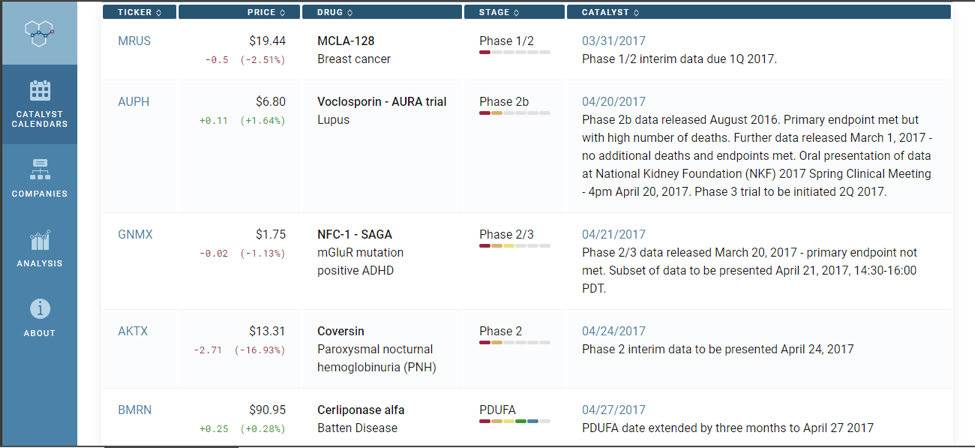На BioPharmCatalyst можно найти множество информации и узнать предполагаемые даты обнародования компаниями данных, касающихся их лекарств, а также даты IPO и PDUFA.