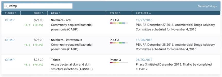 В порядке слева направо идут: тикер, цена, препарат, стадия и ожидаемая дата выхода катализатора. Выберем один из примеров и рассмотрим его вместе. Пусть это будет Cempra Inc. (NASDAQ: CEMP). Просто введите тикер, и вы должны увидеть нечто вроде этого: