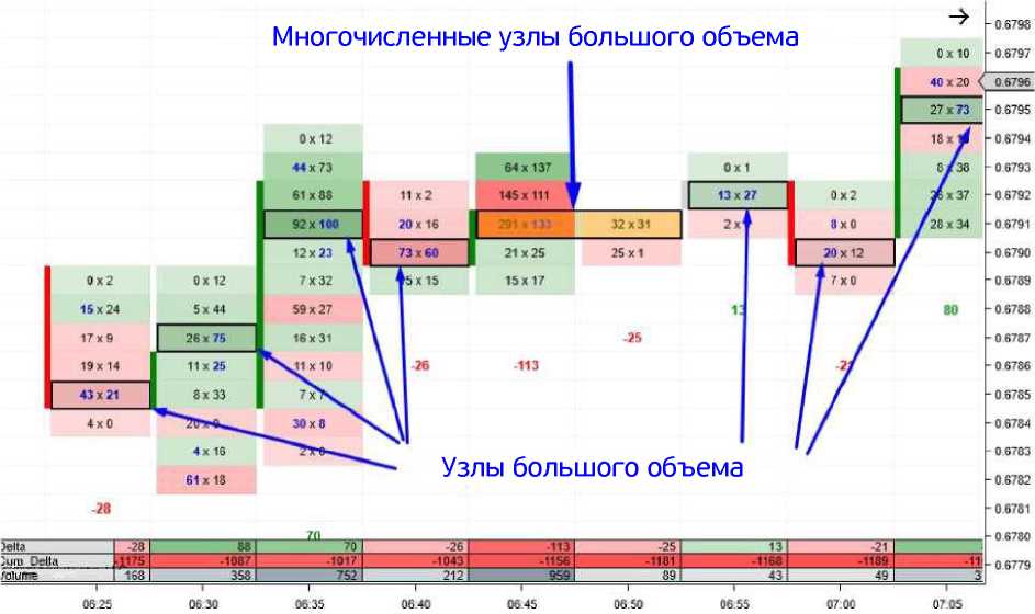 Возможно, самым важным местом в любом следе является узел большого объема. Он представляет собой место, где торговались самые высокие объемы, место, где компании были наиболее активны. Он обозначен черным контуром, что делает его легко заметным с первого взгляда.