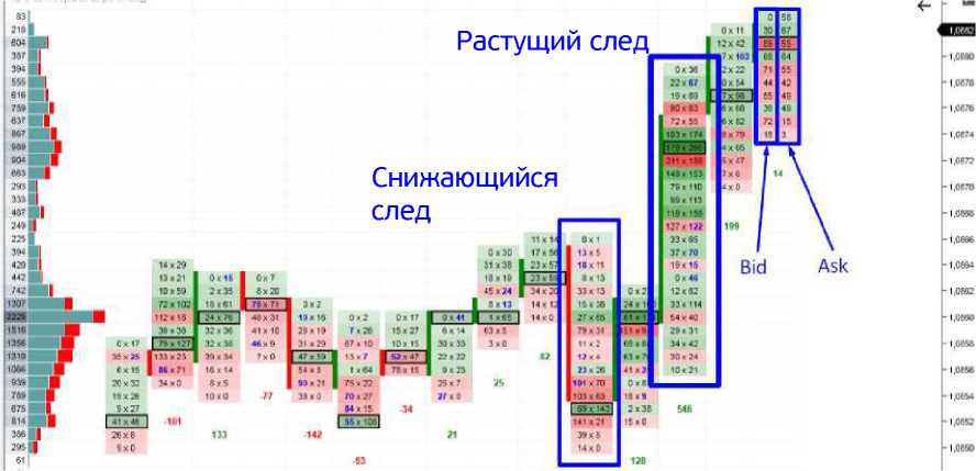 След показывает не только значения открытых, высоких, низких и закрытых позиций, как это делают обычные свечи, но и ордера, которые были выставлены в пределах этой свечи.