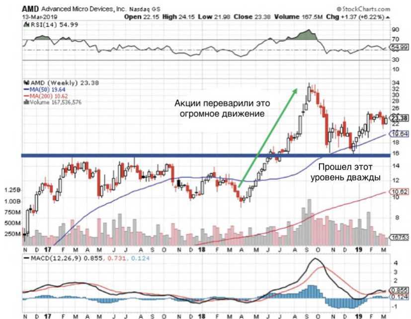 Летом 2018 года у AMD был значительный рост за 6 месяцев: с 9 до 34 долларов. Последние 6 месяцев он консолидировал это движение, колеблющееся между 16 и 25 долларами.