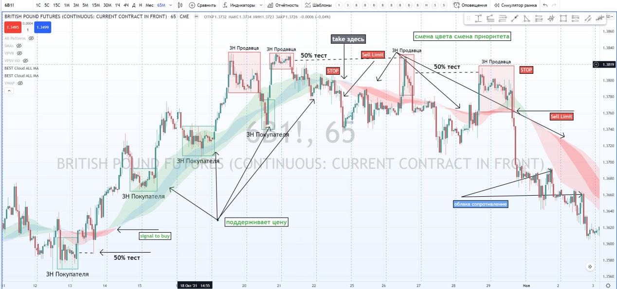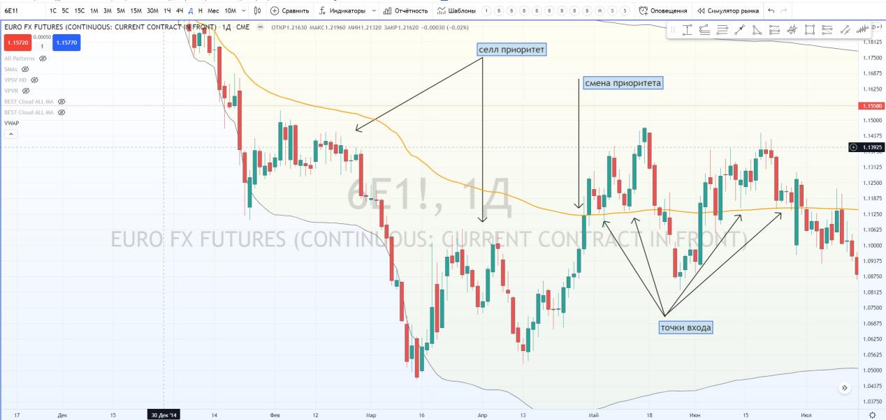 Смотрите, как отлично облака поддерживают цену. И если можно было войти в самом начале смены приоритета, то можно было, подтягивая стопы, хорошо заработать, выйдя при смене приоритета выше.