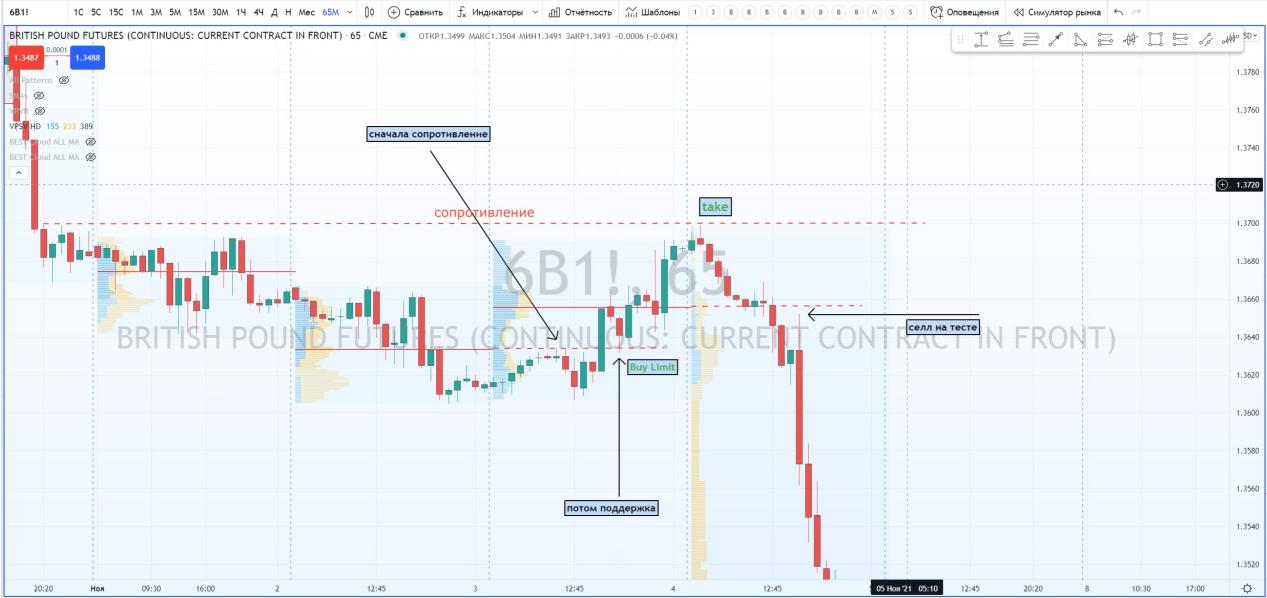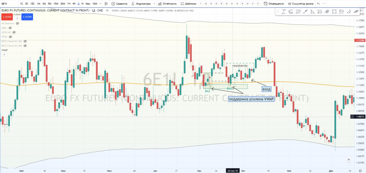 Если перемотаете выше, то увидите график без vwap и точки входа просто на тесте поддержки. Но если учесть и его, то получится дополнительная поддержка, усиливающая сигнал.