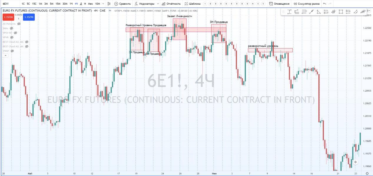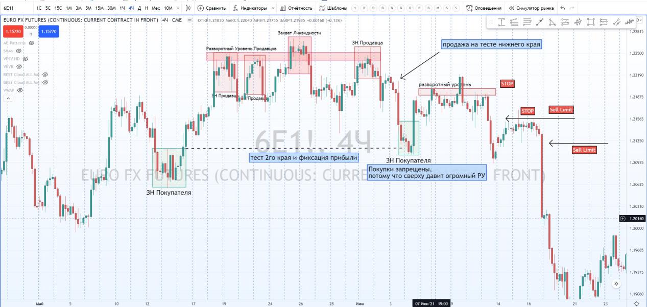 На графике прекрасно видно формирование одного большого РУ продавцов, состоящего из нескольких ЗН продавцов и захвата ликвидности посередине.