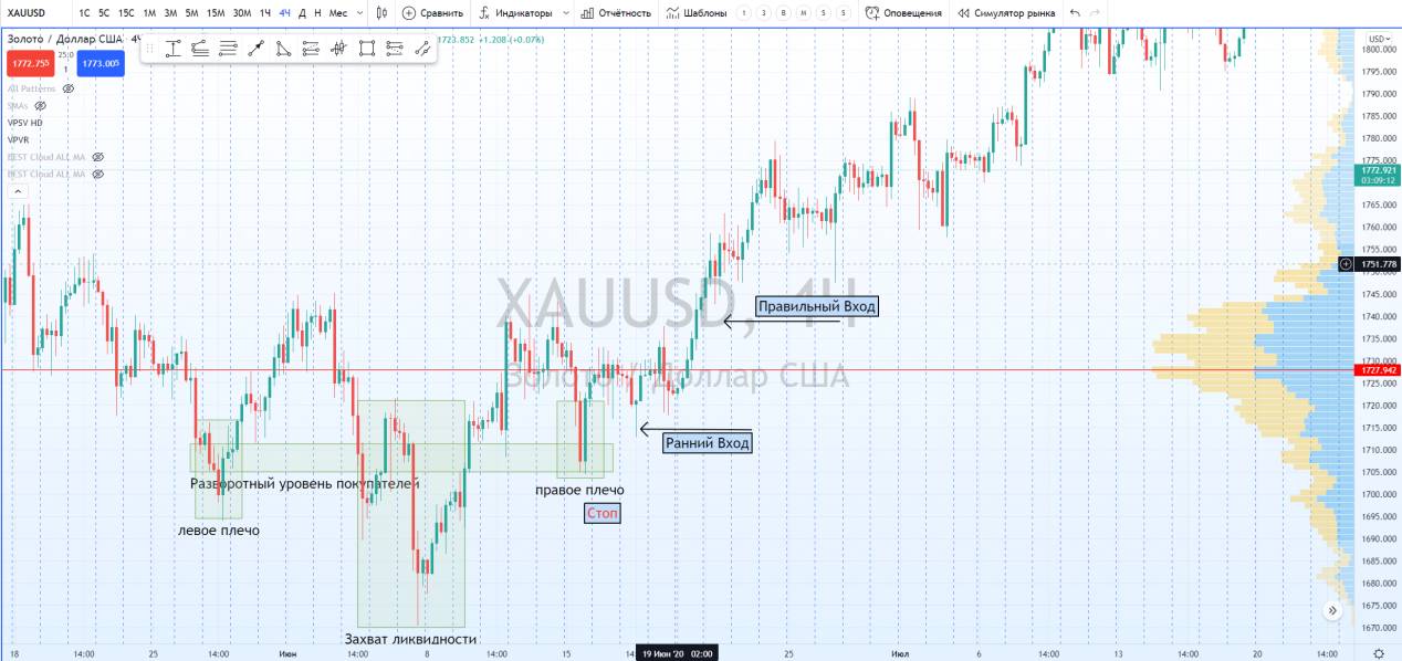 На примере отлично видно 3 ЗН Покупателя, которые представлены левым и правым плечом и захватом ликвидности посередине.