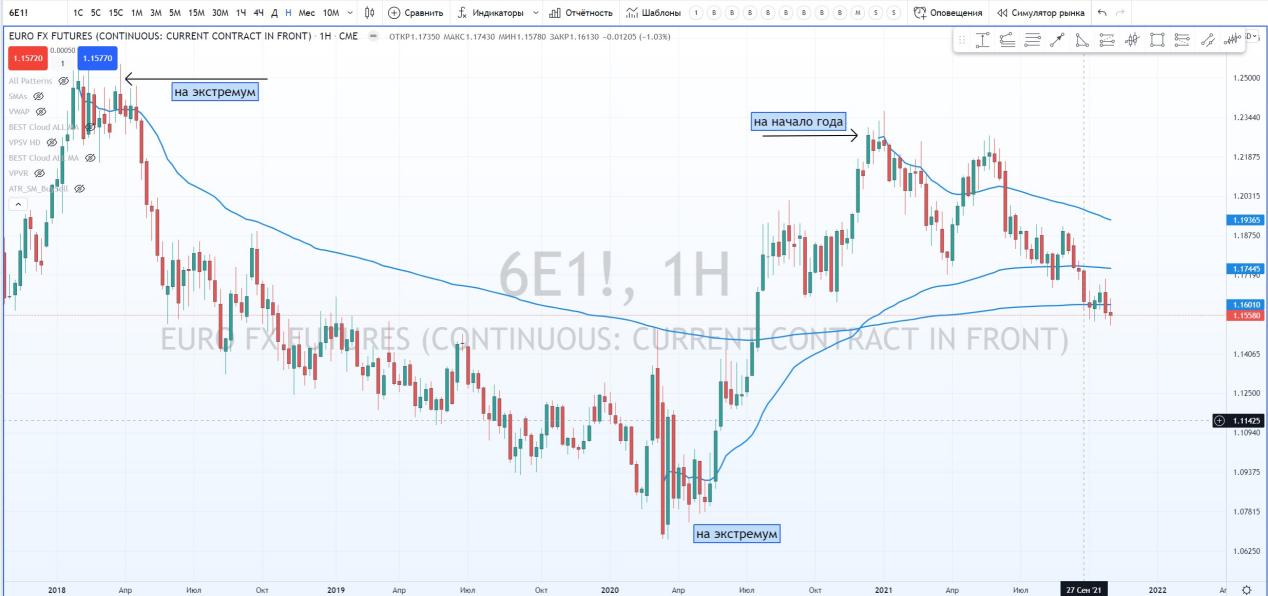Смотрите – здесь я опять вернулся к графику фьючерса евро.