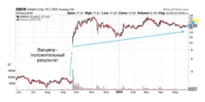 Amarin (AMRN) – ирландская биотехнологическая компания, которая 24 сентября совершила невероятный скачок с 3 до 12,50 долларов. Затем снова почти удвоилась за 6 недель.