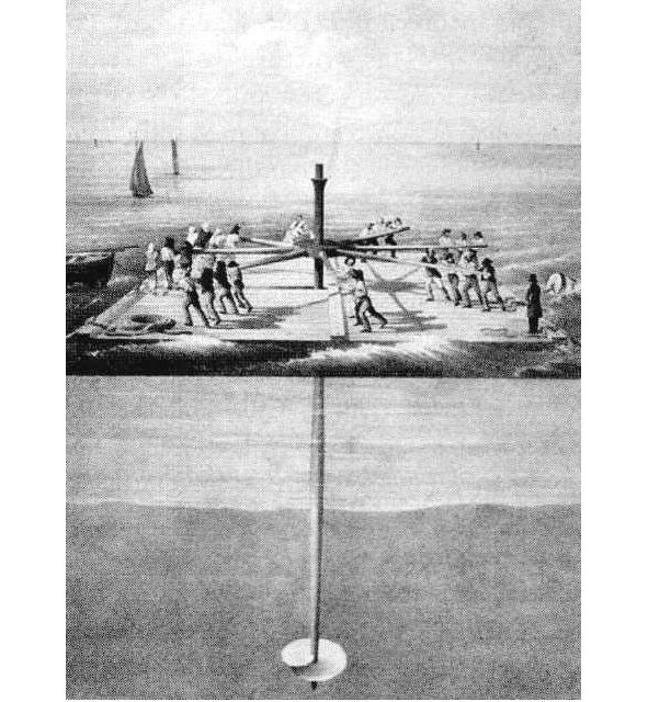 Монтаж свай был достаточно трудоемким – обычно свая устанавливалась на плотах и вкручивалась усилиями лошадей с использованием длинных рычагов.