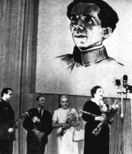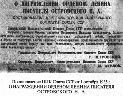Николай Островский – лауреат № 1 премии Ленинского Комсомола. Знак лауреата вручают жене писателя Раисе Порфирьевне Островской первый космонавт СССР Юрий Гагарин; Герой Советского Союза Людмила Павличенко и друг писателя, автор книги «Счастье быть бойцом» Петр Новиков.