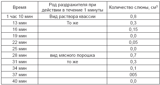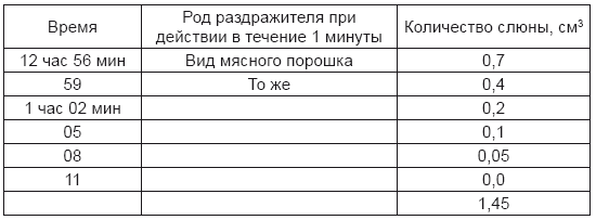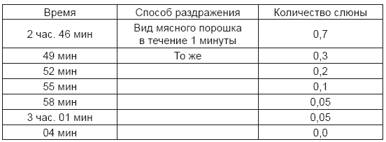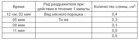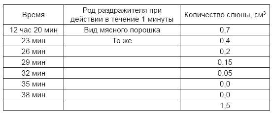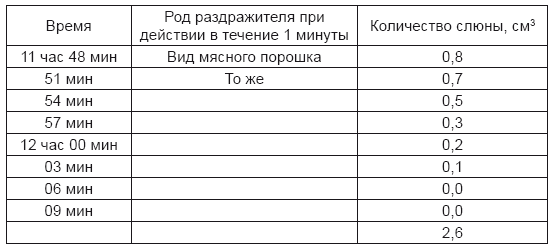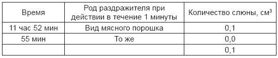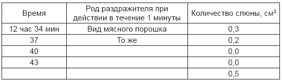 В 12 часов 30 минут дают снова собаке есть мясной порошок, получают всего 3,4 см3 слюны и продолжают опыт.