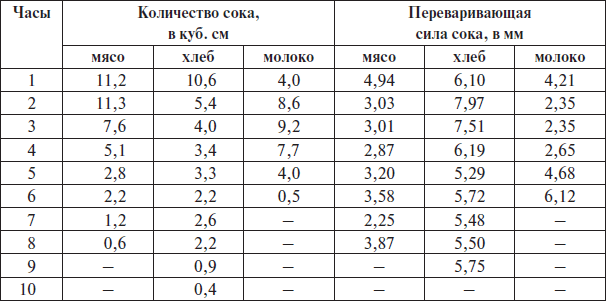 У мясного сока высшая концентрация принадлежит первой часовой порции, у хлебного – порции второго или третьего часа, а у молочного – самой последней часовой порции. Так же характерно положение минимумов, как и вообще весь ход.