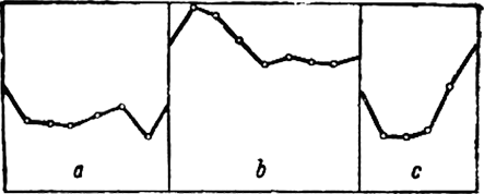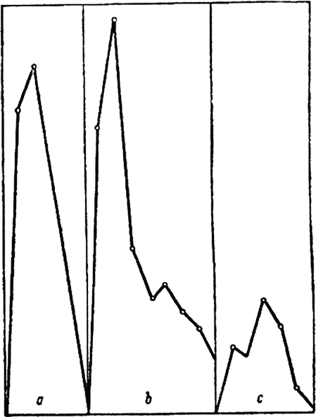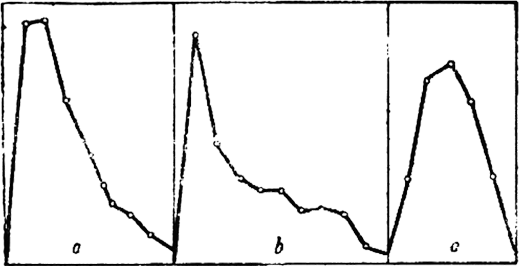 Рис. 7. Колебания переваривающей (белки) способности часовых порций желудочного сока при еде мяса (а), хлеба (b) и молока (с). Единицей меры по вертикальной линии служит 1 куб. см сока