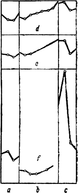 Рис. 9. Колебания ферментных способностей поджелудочного сока при мясе (а), хлебе (b) и молоке (с). В горизонтальном направлении подлежат сравнению одинаковые ферментные способности при разных сортах еды, в вертикальном – разные способности при одном и том же сорте. d – белковый фермент; е – крахмальный фермент; f – жировой фермент
