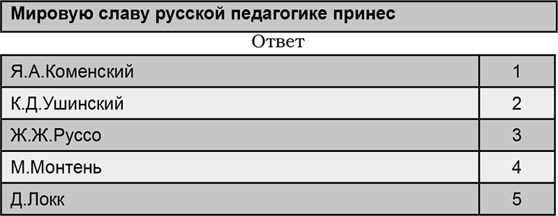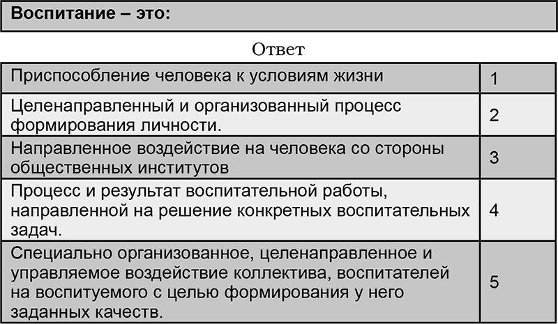 Вначале к каждому вопросу вам предлагается контрольный тест на понимание ключевого понятия. Например, к вопросу «Предмет и задачи педагогики» предложен тест «Предмет педагогики», в котором дается 5 ответов, но только один из них будет верным. В данном случае следует выбрать ответ 4 – воспитание. Правильных ответов может быть и больше, чем один. Также вам могут предложить сконструировать собственный ответ.