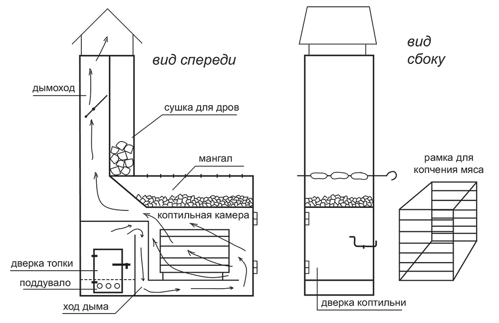 Здесь для сравнения на рисунке 1 приведена схема стационарной коптильни, совмещенной с мангалом. Изюминка, да и то весьма относительная, только в том, что под коптильню используется свободное пространство под мангалом. Тепловое излучение от его пода позволяет не заботиться о равномерности прогрева закладки. Другое удобство этой конструкции – в коптильный отсек можно помещать любую камеру, даже ящик.