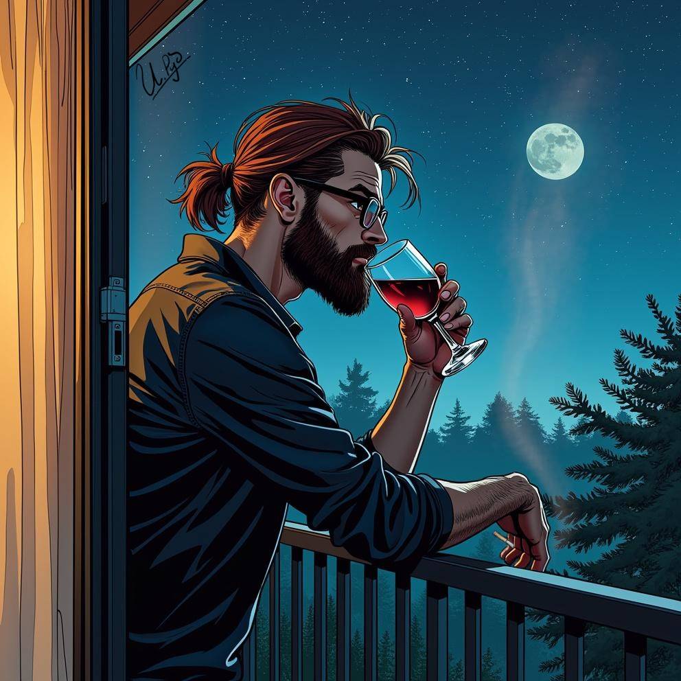 На балконе курил Игорь, отгороженный от хаоса тонкой стеклянной дверью. Он напоминал портрет задумчивого учёного, работы русского художника-передвижника начала XX века. Игорь стоял, опираясь локтем о перила, и смотрел на горизонт, попивая вино из бокала, который держал небрежно, как пробирку. Длинные каштановые волосы были собраны в неаккуратный хвост, седина в бороде серебрилась в лунном свете. Очки съехали на кончик носа, а взгляд, устремленный в звёздное небо, казался одновременно рассеянным и невероятно острым. Казалось, он вычислял траектории галактик, а не отдыхал.