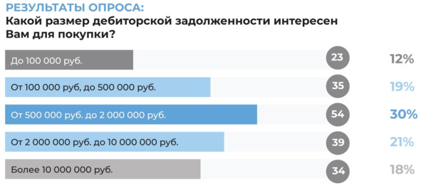 Выяснилось, что долги в любом диапазоне потенциально имеют своего покупателя. Причем, самым востребованным размером долга может быть задолженность в диапазоне от 500 тысяч до 2 миллионов рублей.